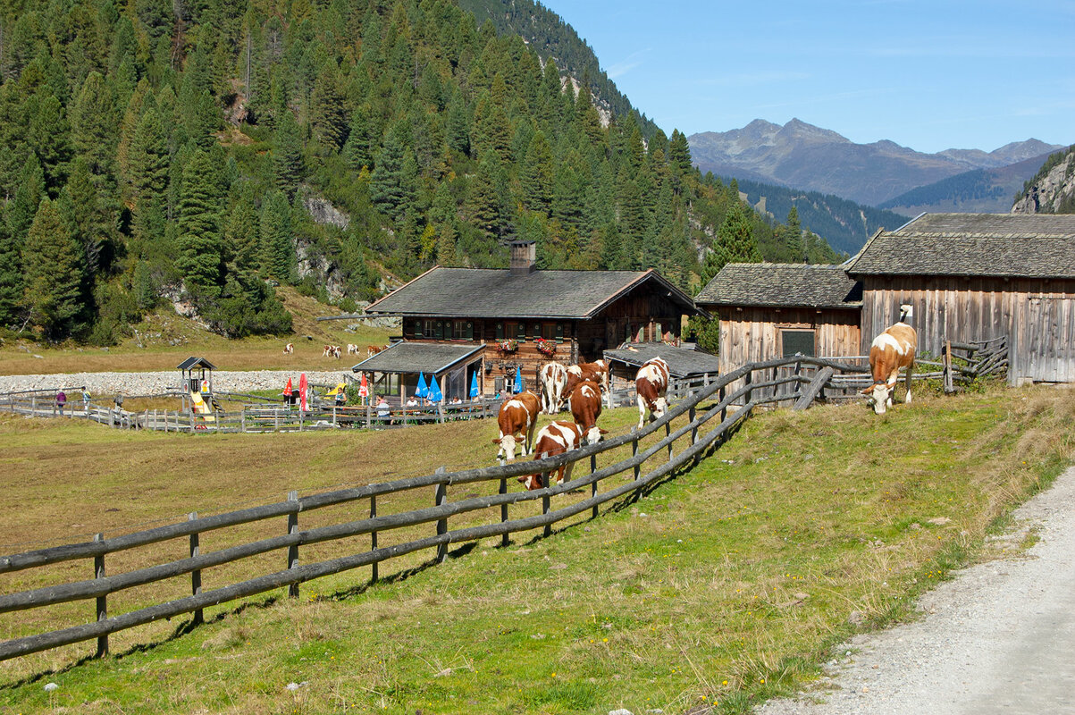 At the entrance to the Krimmler Achental you can expect an impressive mountain panorama and alpine pastures and lush pastures that end below the Krimmler Kees. The distance to the end of the valley under the mighty Dreiherrenspitze is approx. 20 km. The Krimmler Tauernhaus is located approx. 6 km before the end of the valley.