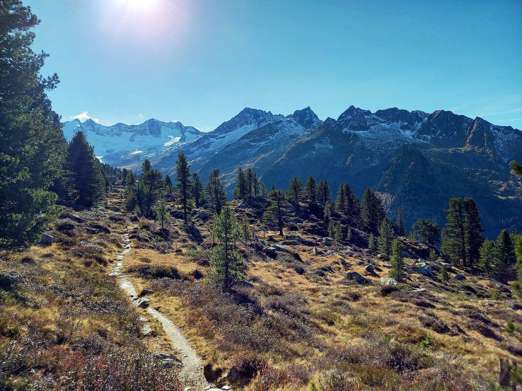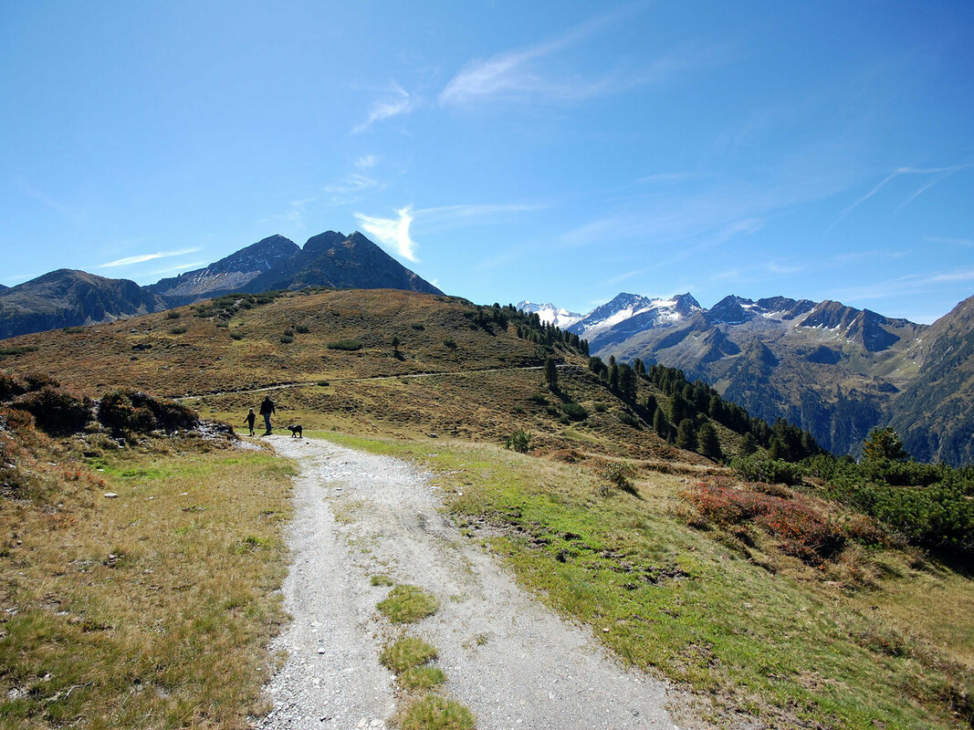 Directions: Ascent to the Gletscherblickalm - via the Hinterplatte to the Breitscharte. The view opens up to the north to the Almdorf Königsleiten and the Kitzbüheler Grasalpen, to the south to the glaciated Reichenspitz group of the Hohe Tauern National Park at the end of the valley and to the blue, glittering Durlassboden reservoir on the valley floor of the Wildgerlostal. If you reach the Breitscharte, you have a wonderful view of the upper Salzach valley. From the Breitscharte the path leads past the Fahrnbühel to the Leitenkamersteig. Past stone pines, over lichen-covered stones, through a landscape made of rock, forest and mountain meadows, which are cut through by clear mountain streams and covered with colorful cranberry and blueberry bushes, you reach the Wildkar-Hochalm at 1970 m above sea level via a well-marked trail. From the Wildkar-Hochalm with its barren alpine meadows for cows and sheep, you climb down a stony, steep forest path to the Trisslam. Sure-footedness and good shoes are required over countless streams, rocks and tree roots! Once you have managed the steep descent, you can see the Trisslam, which is located at 1584 m above sea level, on the valley floor of the Wildgerlostal. From there, the path leads through the bizarre Leitenkamer Gorge over a well-developed, wide, moderately sloping path with numerous benches and viewing platforms down to the Finkau. On the way to Finkau are the green-blue glowing Finkau Lake and the Finkau Chapel. In autumn, the vegetation shines in intense, warm colors and the white glaciers of the Reichenspitz Group reflect the mild sunlight. This is where a hike ends, which is always in season in the warm season, but is particularly attractive in autumn. You can get to the car on the Hinterplatte either with a second car that you have previously parked in the Finkau car park, by taxi or on foot.